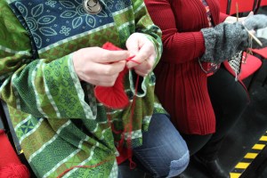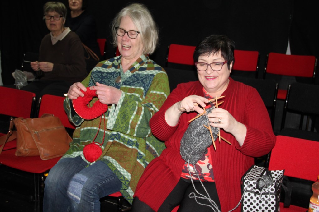 Osalla kuulijoista, kuten Saara Peutere-Heikalla ja Kristiina Virtasella, oli käsityöt mukanaan. Saaran näppärissä käsissä syntyi tuubihuivia entisestä puretusta piposta, kun taas Kristiina kutoi pipoa kummitytölleen superkevyestä merinovillaisesta langasta. Ystävykset ovat olleet ennenkin Lukukoukun yleisössä, ja molemmat kiittelivät tapahtumaa kovin.