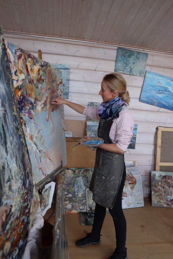 – Kesällä 2021 minulla on Korpilahden Höyry-galleriassa näyttely, mikä on aika iso projekti. Sitä tässä pikkuhiljaa valmistelen, teen luonnoksia ja suunnitelmia. Päijänne on aiheena kiehtova, ja se on monelle keskisuomalaiselle tärkeä. Olen ollut siellä saaressa maalaamassa ystäväni mökillä. Arvostan suuresti sitä kuinka suomalaiset pitävät huolta luonnosta, ympäristöstä ja veden puhtaudesta, ja tätä haluan korostaa maalauksissani. Ja itse asiassa Päijänne muistuttaa omia synnyinseutuni maisemia Venäjällä. Vesistö on lähellä sydäntäni.