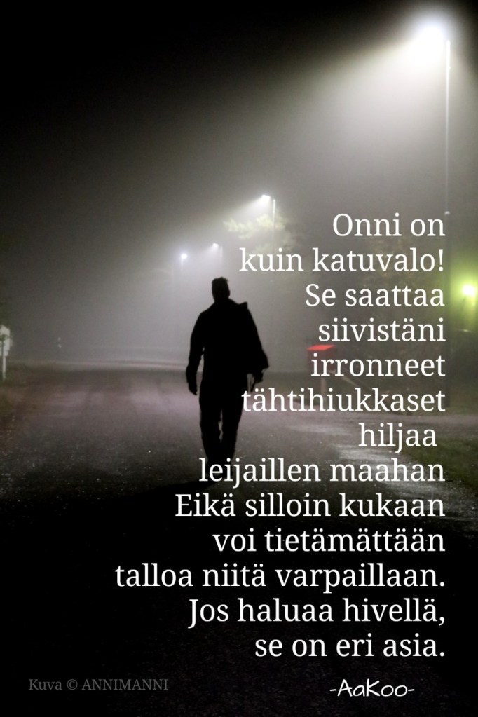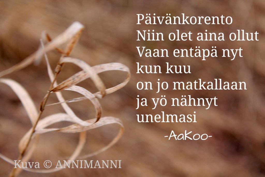 – Reilu vuosi sitten sain idean, että voisin kokeilla miten mun runot sopisi yhteen miniän ottamien hienojen valokuvien kanssa, ja kyllähän ne yhdessä toimivat! Niin syntyi Instagramissa aakoo_runokuvat.