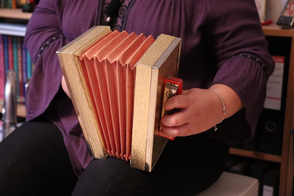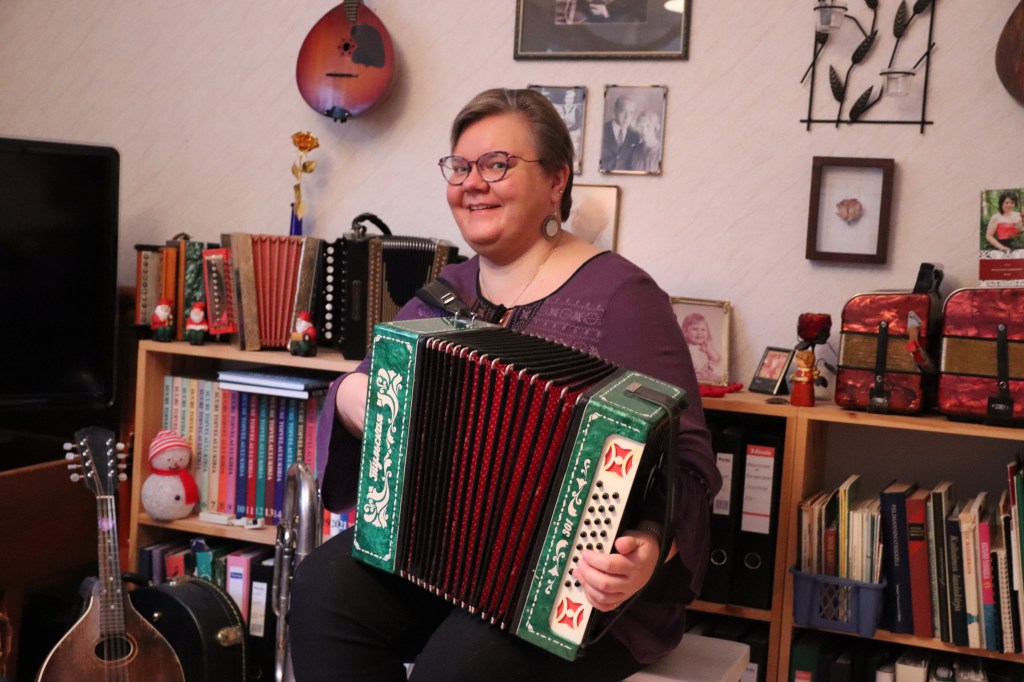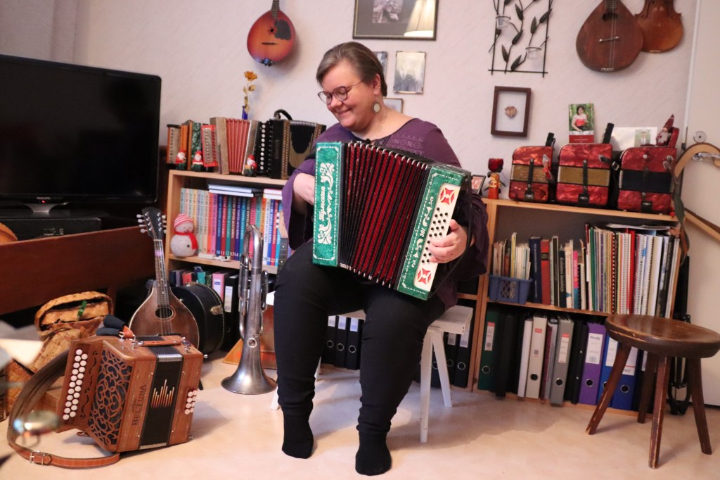 Katja on tuttu monista eri kokoonpanoista. Haitari on pääsoitin, mutta myös mandoliini soi taitavissa käsissä hienosti, mistä saankin ilahduttavan näytteen. Voisin kuunnella Katjan soittoa loputtomiin, ja etenkin mandoliinin äänessä on jotain erityisen lumoavaa.