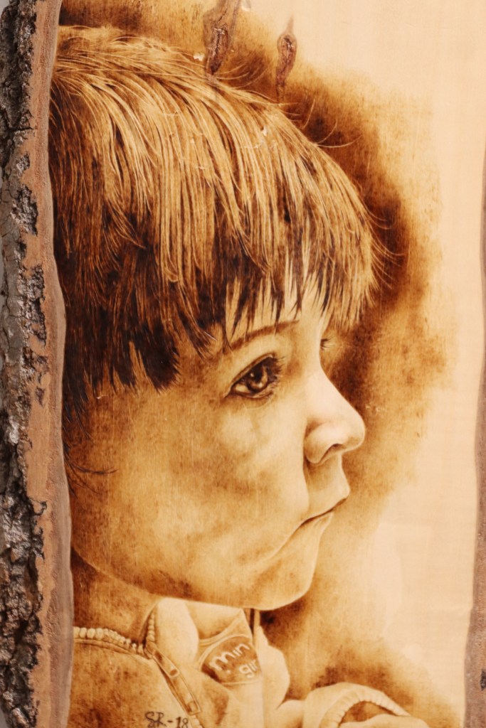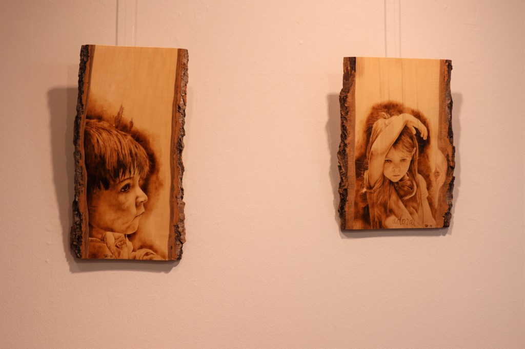 Kivipankissa on nähtävillä jämsäläiseltä Susannalta myös toisenlaisia taidonnäytteitä, pyrografiateoksia, eli kolvintapaisella terällä piirrettyjä puutauluja. Piirtojälki syntyy puupinnan kuumentamisesta. Todella yksityiskohtaiset taulut esittävät muun muassa lapsia, ja niiden äärimmäinen realistisuus on suorastaan huikeaa. Kuten Eine kertoikin, Susanna on erittäin taitava piirtäjä.
