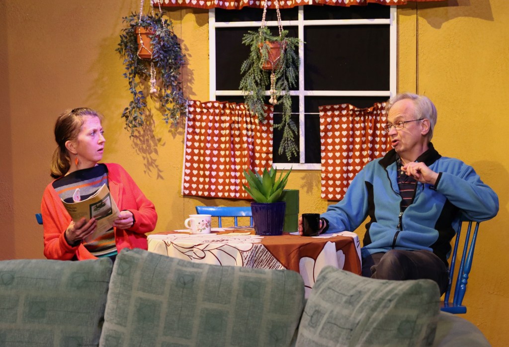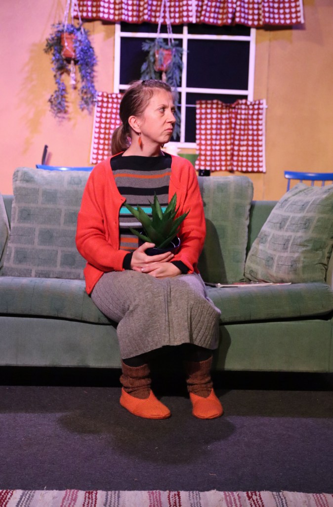 Mutta missään nimessä esitys ei siis ole synkkä, vaan ihan päinvastoin. Tekstiä on paljon, ja henkilöhahmojen sanailu on varsin lennokasta. Peltolan näytelmät ovatkin usein kielellisesti erittäin kiehtovia.
