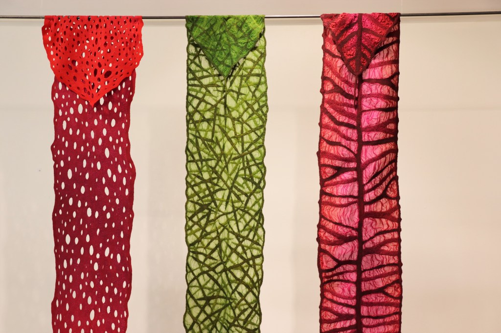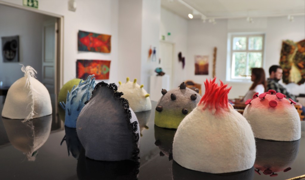 – Väriä on ja muotoilussa riittää! Mukana on muun muassa unkarilaisen huopataiteilija Jodit Pócsin ryhmä, yhteensä seitsemän unkarilaista tekijää. Heidän omaa perinnettään on näkyvissä, vaikka teokset ovatkin moderneja, Sirpa kertoo.