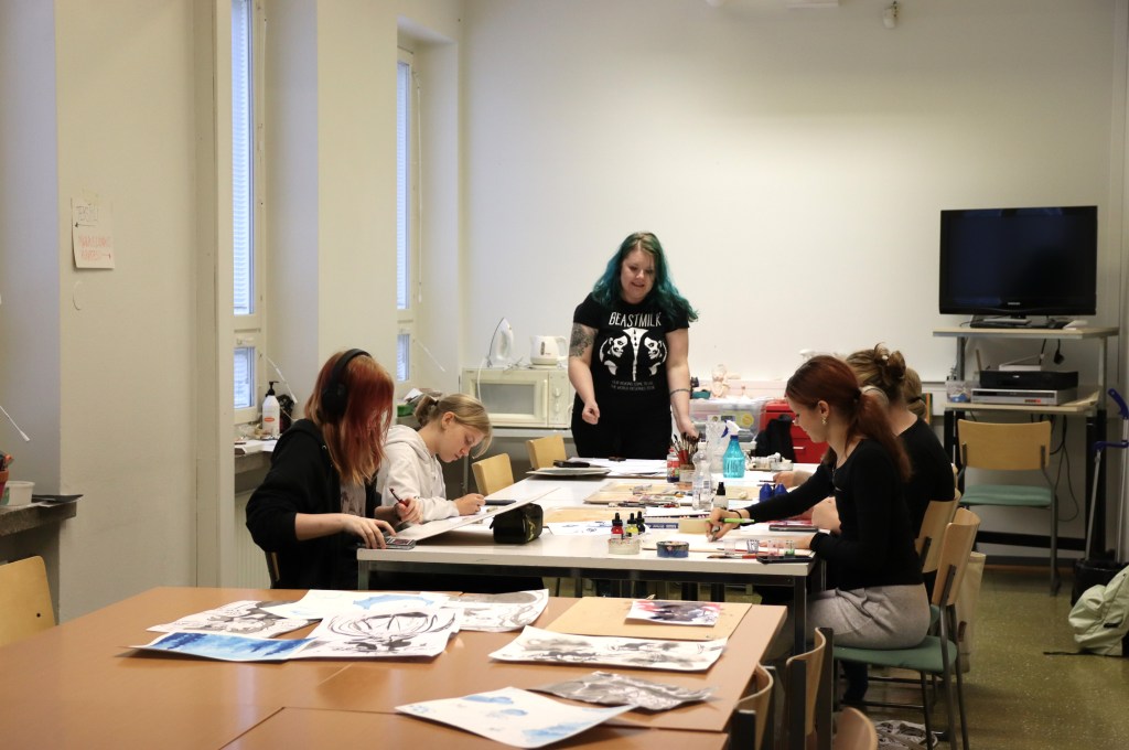 – Niin ja ollaan me tutustuttu Kuvataideseura Värinään ja tehty vierailuja paikallisiin näyttelyihin. Yhdessä keskustellen pohditaan teoksia ja puhutaan taiteesta muutenkin, opintoihin liittyy myös taiteen analysoinnin ja tulkinnan taitojen harjoittaminen, Sirpa lisää.