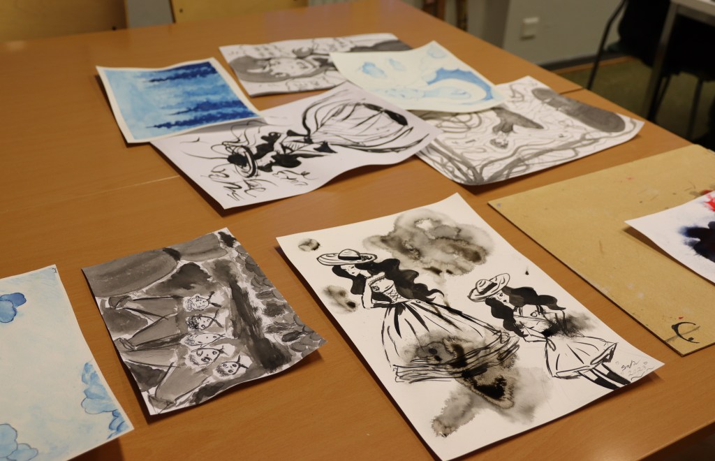 Osa jatkaa viimekertaisten mustetöiden parissa, joku tekee öljypastelleilla, joku piirtää. Ajatuksena on, että jokainen testaa musteita, ennen kuin siirrytään seuraavaan tekniikkaan, öljyväreihin. Kyseessä on jatkava ryhmä – tänä syksynä käynnistyi kaksi taiteen perusopetuksen ryhmää, aloittavia oppilaita ohjaa Päivi Riihinen, ja jatkavaa porukkaa Sirpa. Kummallakin on laaja kokemus taiteen alalta.