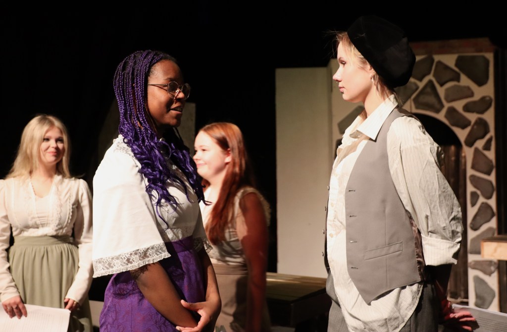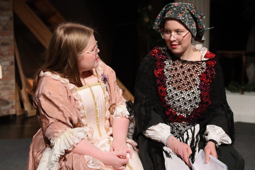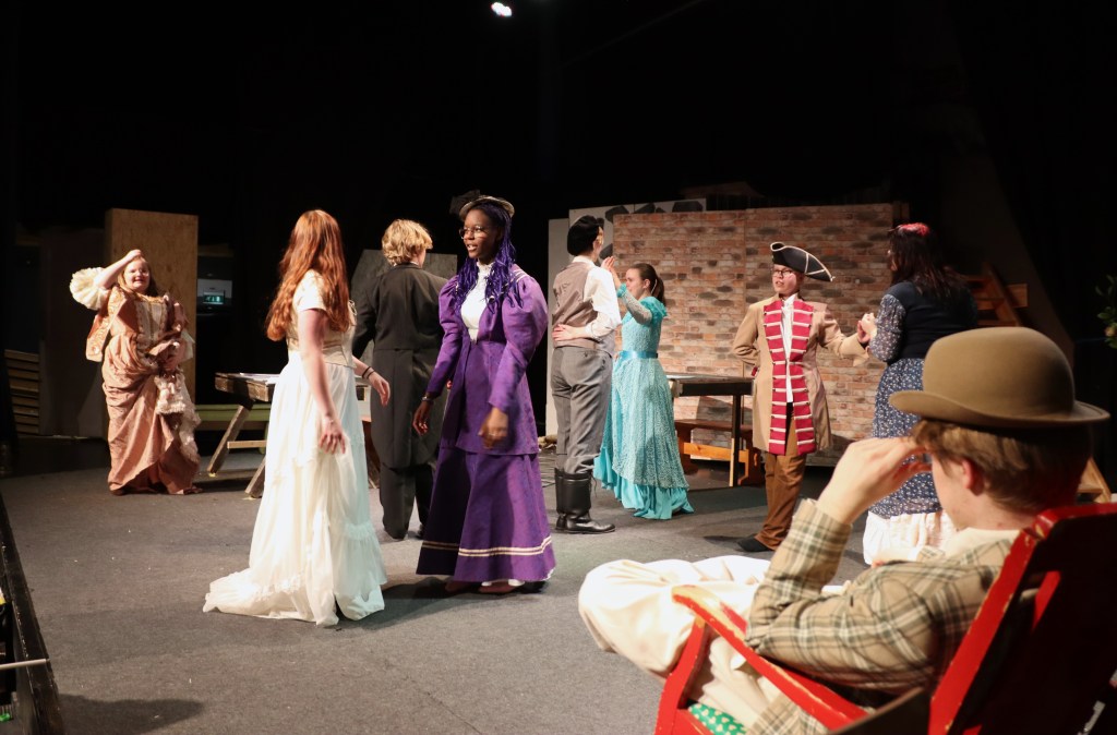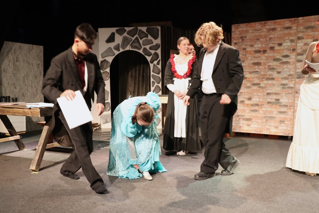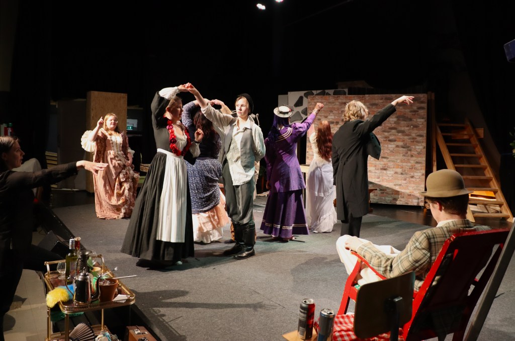 Heti alusta asti on selvää, että energiaa tällä porukalla riittää. Iloinen pulina ja hyörinä täyttää teatterin, vaihdetaan roolivaatteita, yksi keskittyy repliikkien opiskeluun, toinen pohtii miten menuetin askeleet menivät, entä musiikin ajoitus, vaihdetaan kuulumisia ja tuumitaan esimerkiksi keinutuolin oikeaa paikkaa.