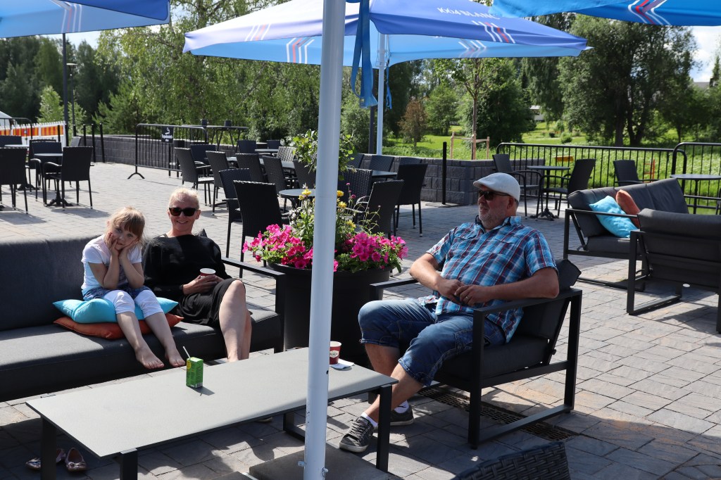 Sofia Asunmaa, Anne Silván ja Marko Asunmaa viihtyvät Kahvila Jokirannassa.