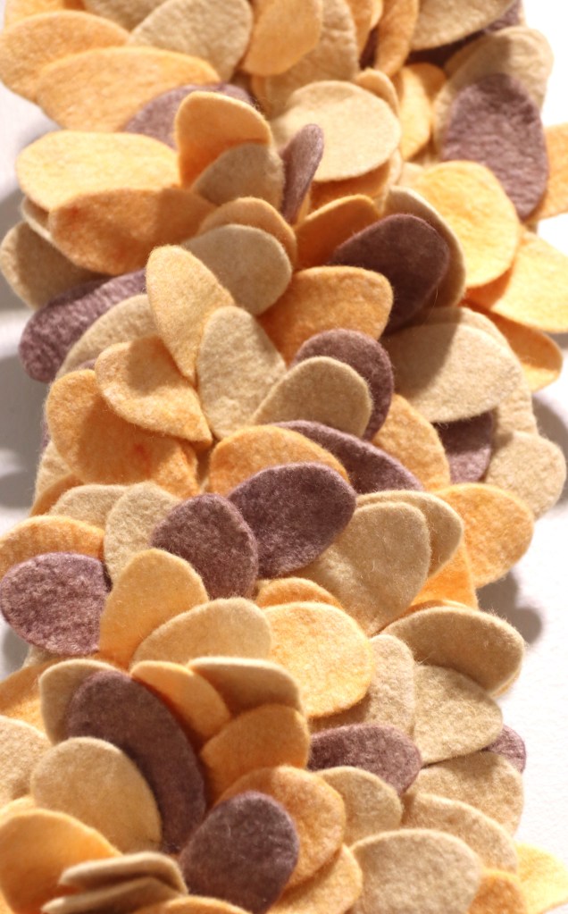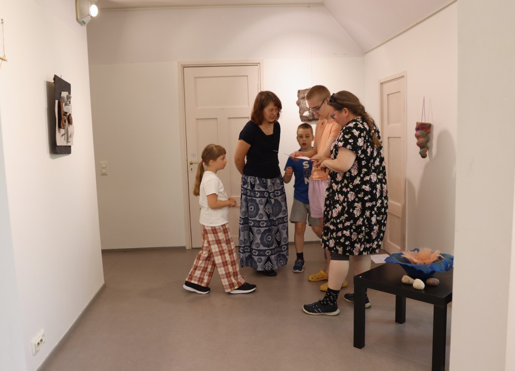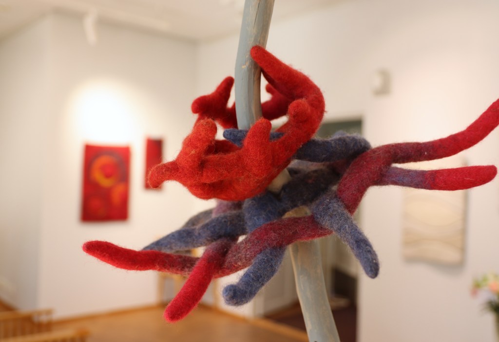 Esillä on nelisenkymmentä teosta, kansainväliset työt ovat saapuneet Saksasta. Mukaan kutsuttiin yhteensä seitsemän opettajaa Filzschule Oberrot -koulusta. Sirpa kertoo, että saksalaisten teokset ovat tehneet suuren vaikutuksen.