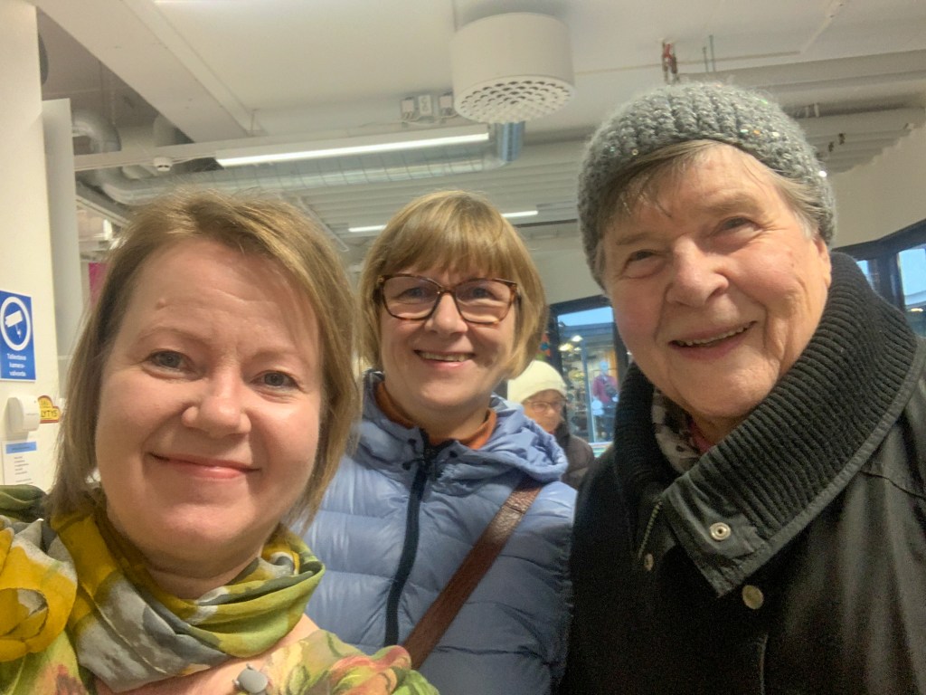 Miia tapasi Jämsän kirjamessuilla entisen liikunnanopettajansa Eira Halme-Hartikaisen ja tämän tyttären, Miian rinnakkaisluokalla opiskelleen Sanna Kaasalaisen. Kuva: Miia Saari