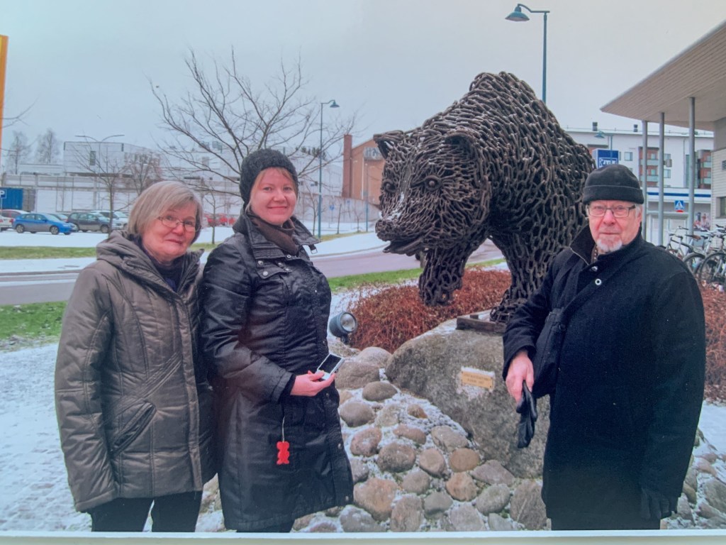 Raili Saari, Miia Saari ja Pekka Saari Eino Rautaruohon Karhu-patsaan äärellä. Kuva: Miia Saaren kotialbumi.