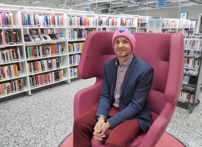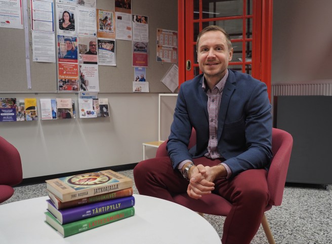 – Vaimoni odotti meidän lasta, ja olin mennyt lipsauttamaan kaksi lupausta: kalliiden lastenvaunujen hankita sekä kirjan kirjoittaminen tulevalle lapsellemme. Siitä se sitten lähti, Jori muistelee nyt vuosia myöhemmin Jämsän kirjastolla.