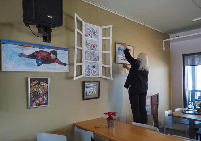 Nina rakentamassa näyttelyään Ravintola Rinteessä.