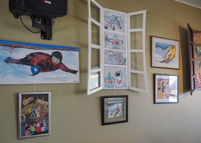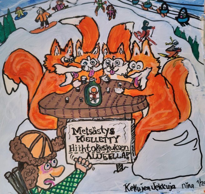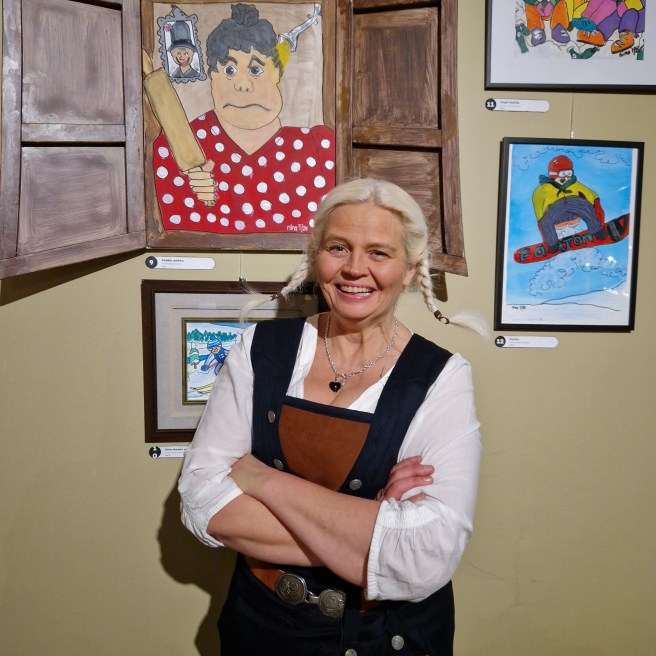 Vuodesta 2020 asti aktiivisesti taidetta tehnyt Nina sai viime syksynä ajatuksen, että taiteen ja laskettelun voisi yhdistää, ja tuoda näyttelyn lähelle rinteitä. Värikkäissä teoksissa on lämminhenkistä huumoria, ne vilisevät yksityiskohtia, ja niihin on upotettu useita tarinoita ja suomalaisia sanontoja. Ehdottomasti hyvän mielen näyttely, jonka äärellä ei voi olla hymyilemättä. ITE-taiteilija, eli itseoppinut Nina kuvailee maalaustyyliään rebel-naivistiseksi.