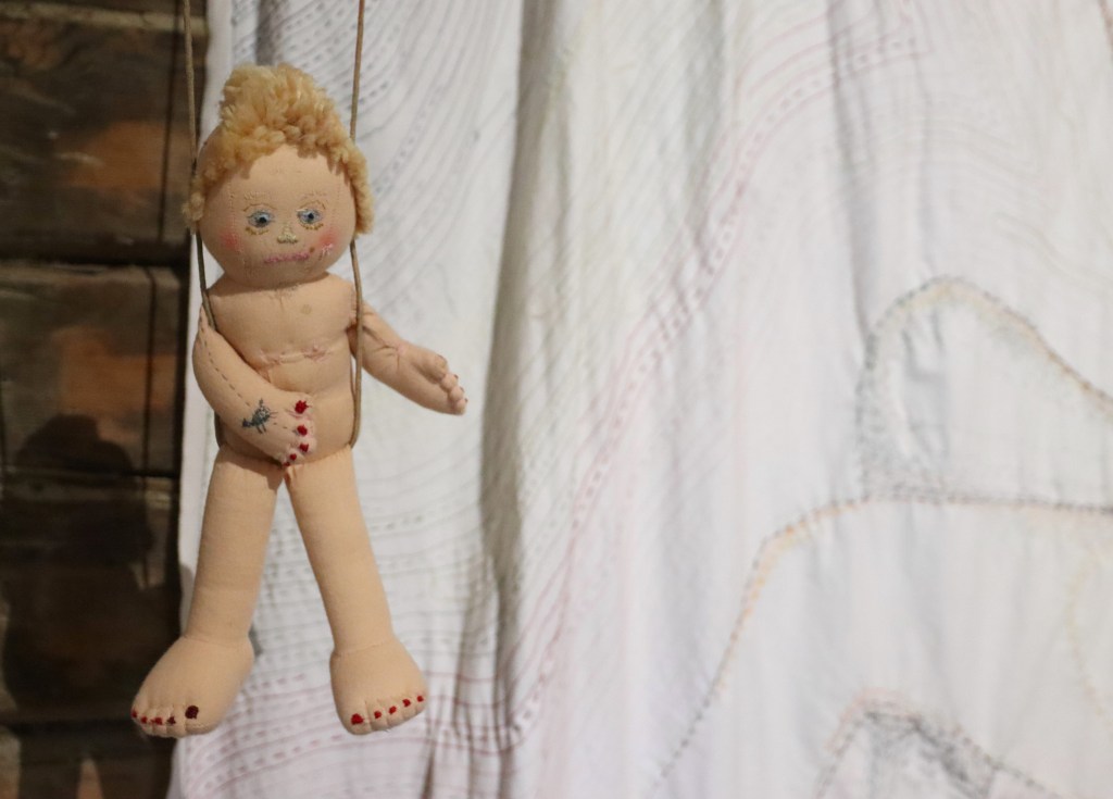 – Teoksissa olen käyttänyt muun muassa vanhoja lelujani tai lapsuudenaikaista lakanaani. Intohimoni on kierrätystaide, pyrin muutenkin käyttämään materiaaleja joita ei tarvitse ostaa. Esineet ja materiaalit itsessään jo inspiroivat, on kiehtovaa pohtia mitä kaikkea voikaan yhdistellä ja mitä tarinoita niistä muodostuu.