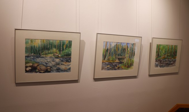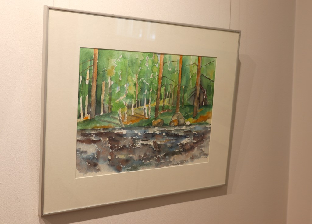 – Teemana vesi viittaa paitsi teosten aiheisiin myös tekniikkaan, eli akvarelleihin, joita täällä on esillä 26. Akvarellissa vesi vie väriä ja väri vettä, veden ja värin vuorovaikutuksesta syntyy usein yllätyksiä, onnistumisia ja tietenkin myös epäonnistumisia. Juuri tämä arvaamattomuus on kiehtovaa.