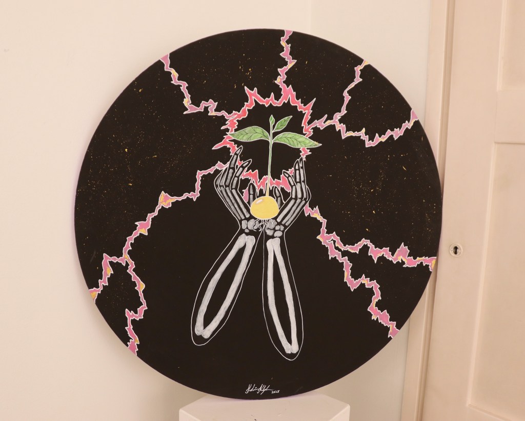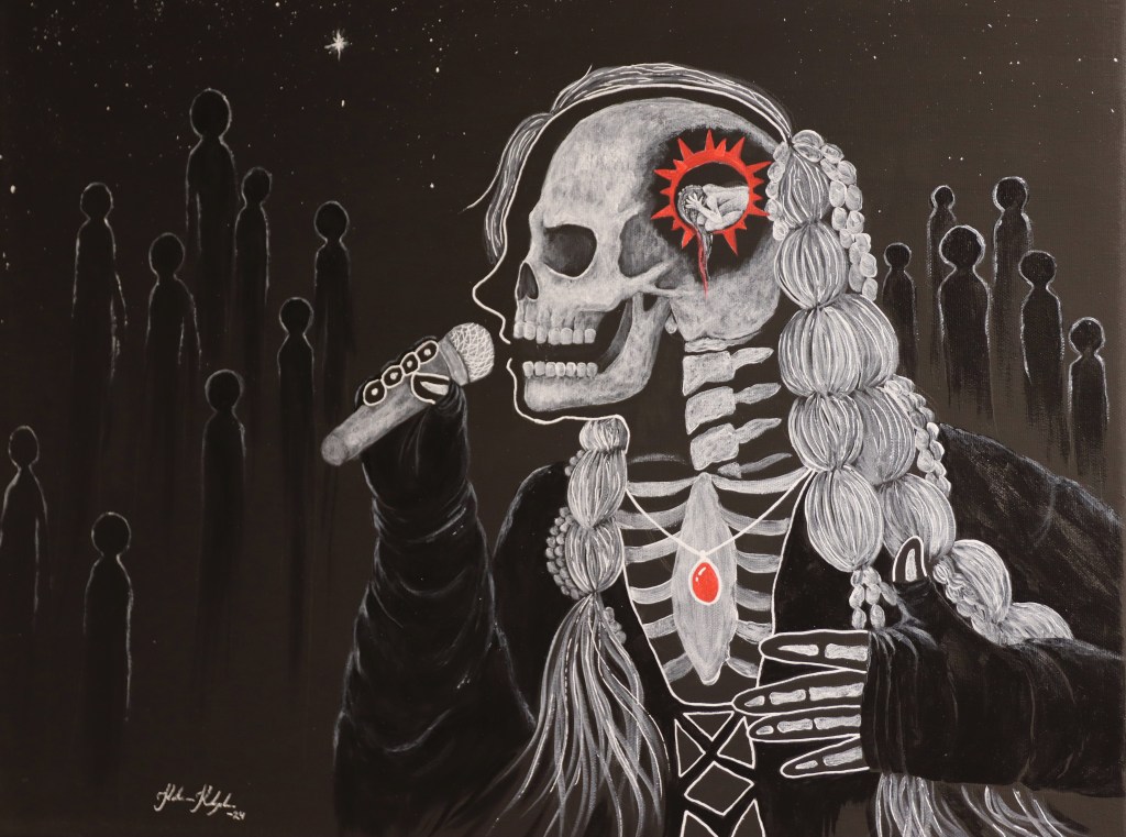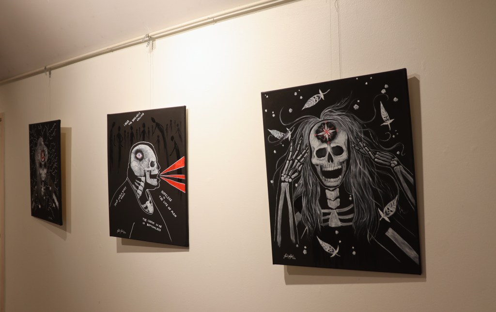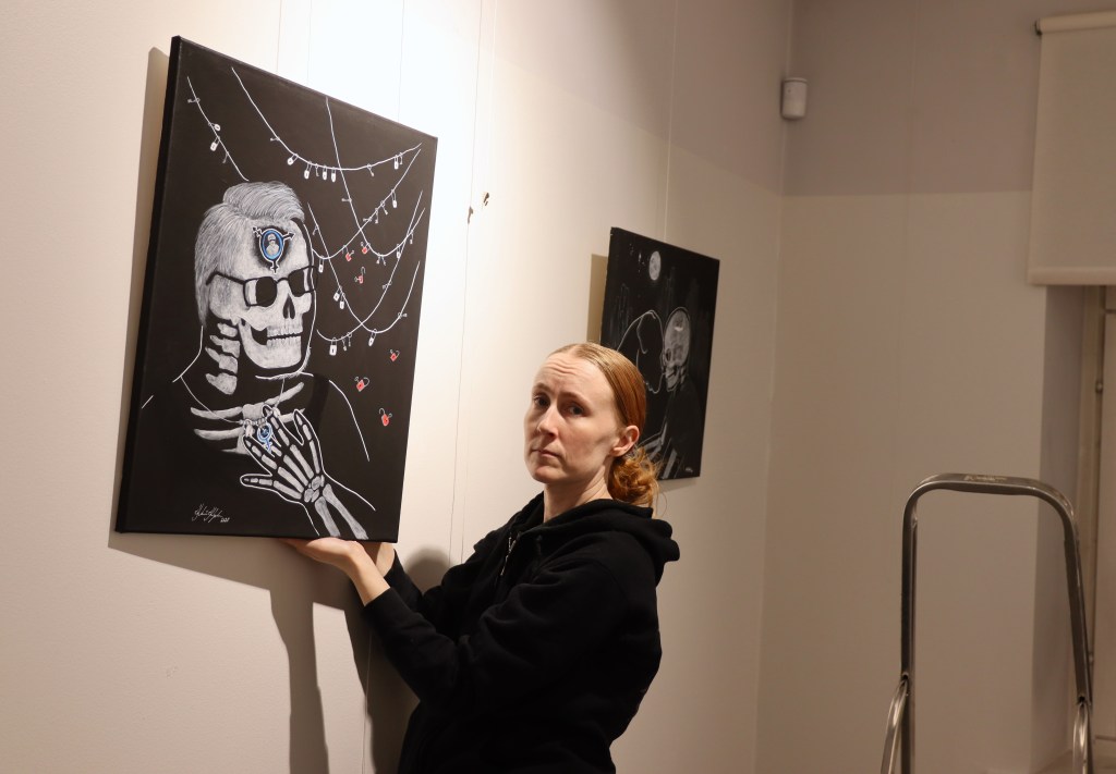 Kivipankin yläkerrassa siirrytään aivan toisenlaiseen tunnelmaan. Kouvolassa asuvan Karoliinan teokset ovat aitoja tarinoita ihmisten traumaattisista kokemuksista ja kamppailuista. Kaamoskansaa tuonen tiellä on itse asiassa enemmän kuin näyttely, se on laajempi projekti.